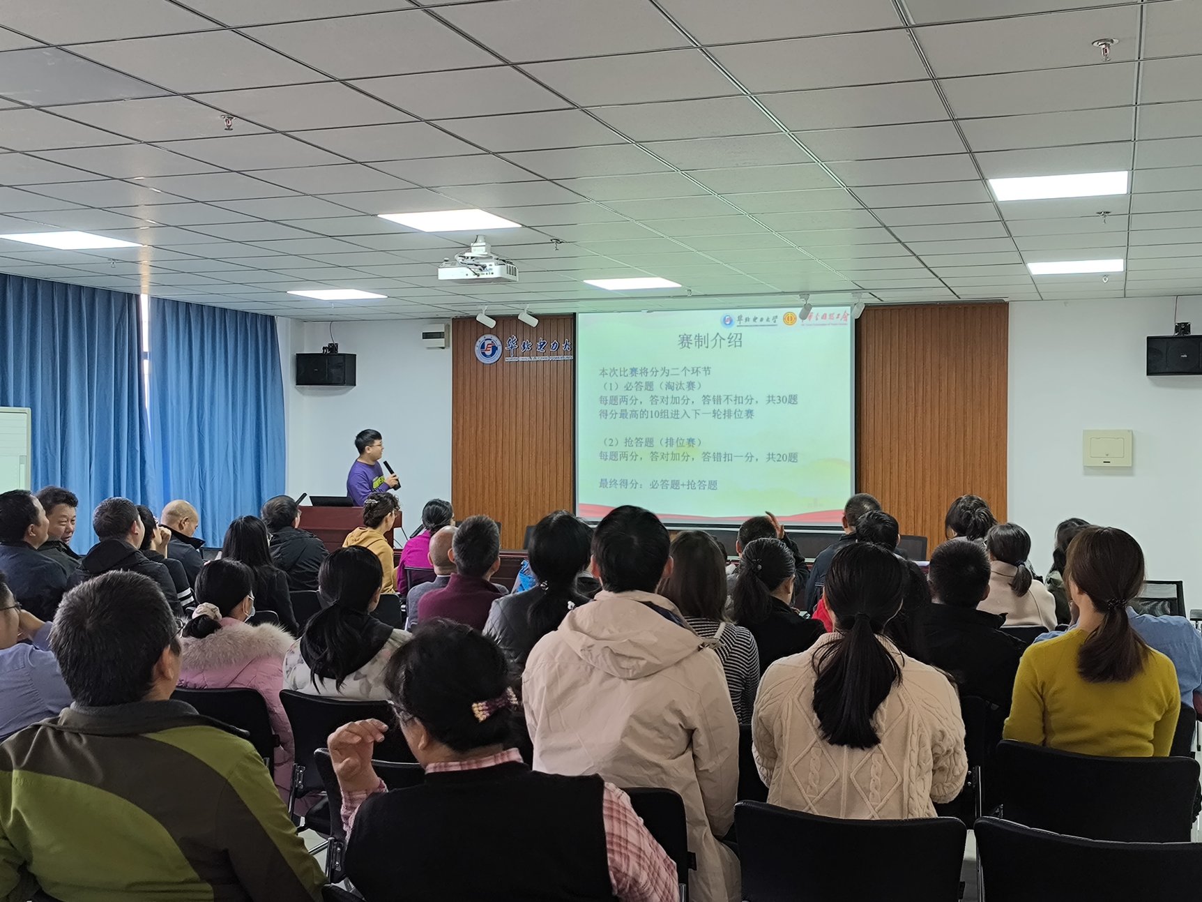 比赛分为两轮进行,第一轮为必答题环节,此环节每组派一名成员在小程序上作答,共计30道题,每题2分,答错不扣分,第一轮将竞选出得分最高的10支队伍参加第二轮比赛;第二轮比赛为抢答题环节,10支队伍举号牌进行抢答,共计20题,答对得2分,答错扣1分,两轮成绩相加为每支队伍得最终得分。