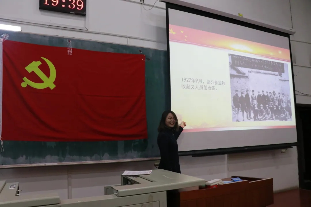 第二组的郭嘉悦同学为我们讲解了秋收起义时期的主要事件、革命英烈和党在当时的纪律建设。1927年9月9日,毛泽东在湘赣边界领导的秋收起义爆发,工农革命军几经奋战,艰苦跋涉,面对几十倍之多的敌人无异于以卵击石,白色恐怖笼罩全国,革命事业正处于生死存亡之际。