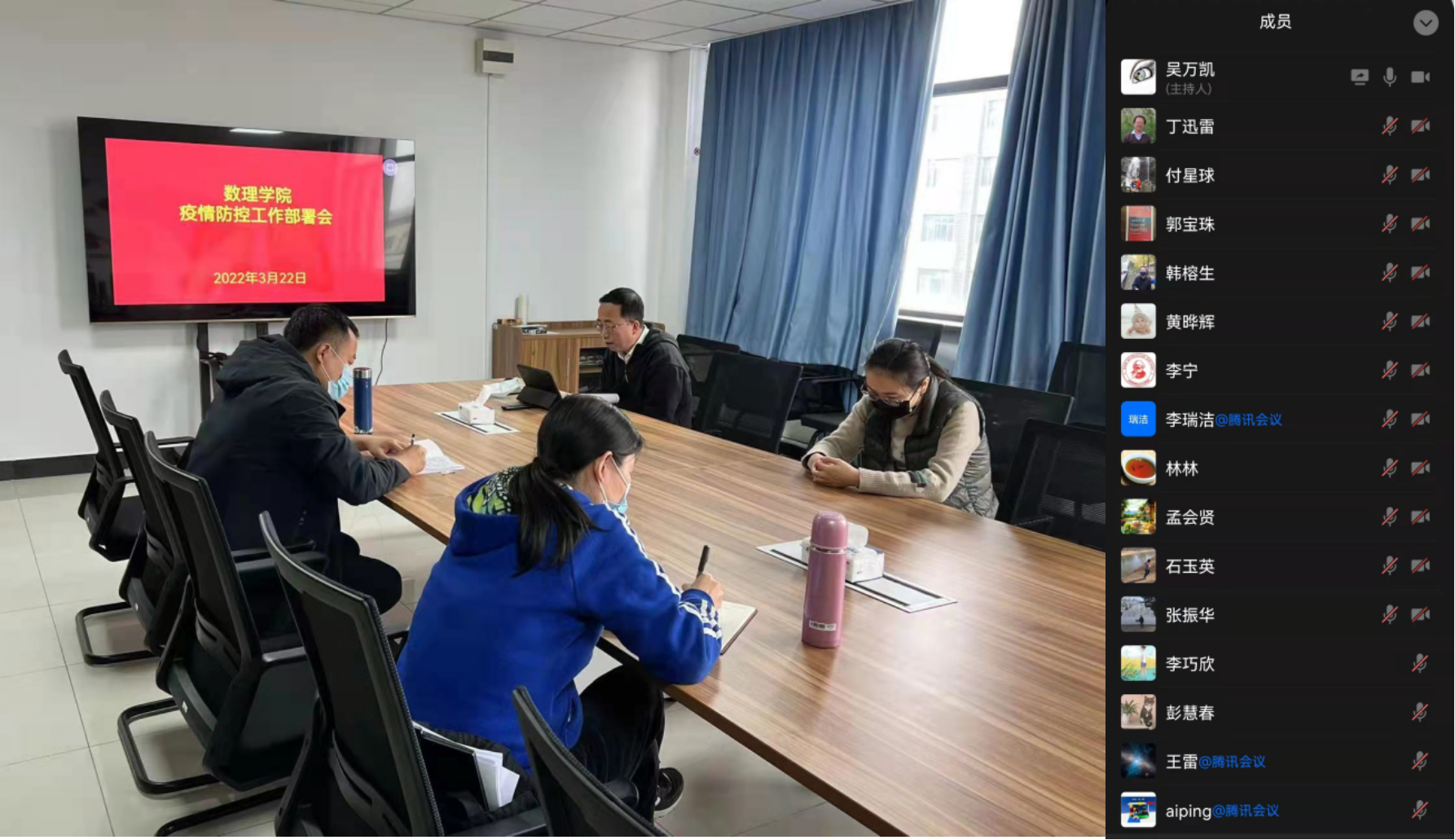 3月22日,数理学院党委召开疫情防控工作部署会,传达贯彻学校疫情防控部署会精神,进一步落实学校疫情防控工作部署。学院全体党委委员、领导班子成员、各教工党支部书记、教研室主任、研究所所长和辅导员通过线上线下相结合的方式参会。院党委书记吴万凯主持会议。