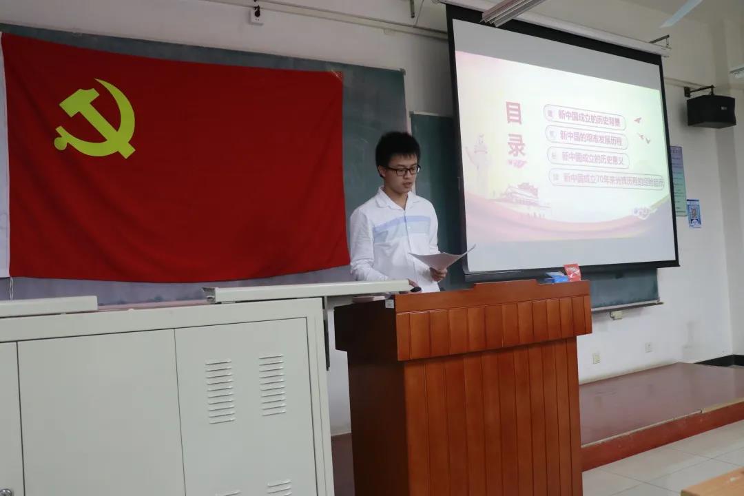 第五组的胡正伟同学为大家分享的主题是“新中国的成立”,他从新中国成立的历史背景、艰难发展历程、历史意义以及新中国成立70年来光辉历程四个方面为大家做出分享。